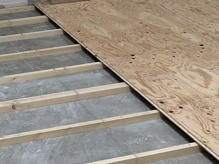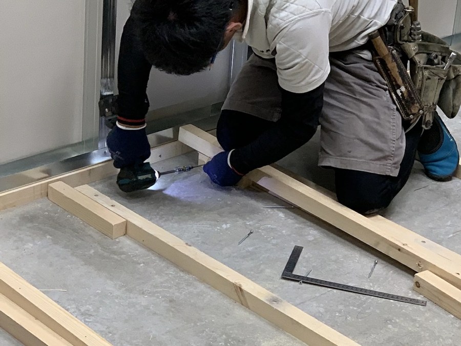 角材は30cmピッチ。間隔を詰めて板のたわみを防止します。