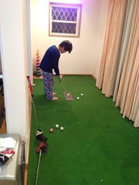 弱ければブレーキがかかるように止まり、強すぎるとスーっとオーバーしてしまい、まさに実際のグリーンそのものです (山梨県のM様:90cm×4m SUPER-BENTパターマット) 『今までは30cm×2.5mのパターマットを使っていましたが、パターマット工房さんの商品の評判の高さを知り、購入にいたりました。 一番のポイントは、パターマットの幅や長さが自由に選べることでした。幅が90cmあれば、斜めに使うことで、目標にパターフェースやアドレスを合わせる練習に良いのではないかと思いました。また、長さも2.5mでは短く感じていたため、4mにしてみました。 使用しての感想ですが、幅が広いので、斜め使いができ、練習にはもってこいです。長さも4mにして正解でした。 打ってみての感じですが、弱ければブレーキがかかるように止まり、強すぎるとスーっとオーバーしてしまい、まさに実際のグリーンそのものです。 手で触った感触も良いうえに、2階のフローリングの上で使用していますが、ボールが転がる音も問題ありません。 (今まで使用していたものは転がる音がうるさかったので、夜使用するときは家族に不評でした。) 「まっすぐぱっと」は、自分のストロークの確認をするには最適です。 特にフォロースルーの意識が強く持てるようになり、ヘッドアップも矯正できる感じです。 「距離感マスターカップ」もカップオーバーの感触を掴む事が出来て重宝しています。 パターマット工房さんで商品を購入し、非常に満足しています。 素晴らしい練習環境が整いましたので、あとは、このパターマットでどれだけ練習し、パットの腕を上げられるか・・・・・自分次第です。 本当にありがとうございました。』 |