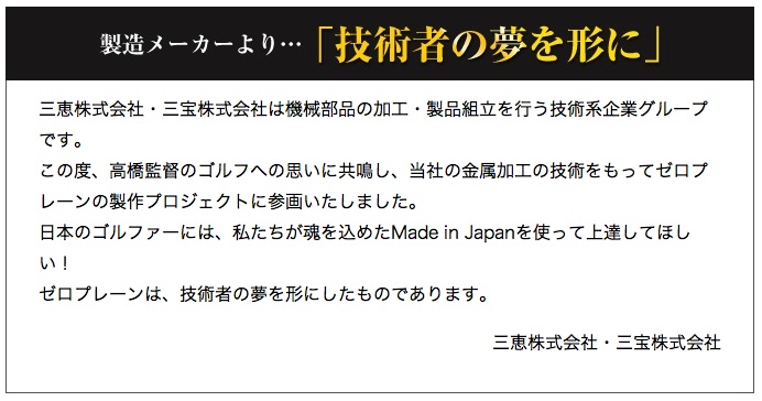 | ゴルフは本来1本のクラブを両手で持って打つスポーツだがそのクラブを「握る」という動作が、実は上達を阻害する原因ともなっている。 真剣にクラブを握るほど、体のあらゆる力が上体に集中し筋力が硬直する。 力みによるイップスは、程度の差こそあれ誰もに出現しショットミスを引き起こしている。 ゴルフ以外の球技(野球、卓球、テニスなど)と、「ボールを打つ、運ぶ」感覚は共通しているが、ゴルフはボールが止まっているために余計に力が入りグリップを強く握ってしまうのだ。 そこで右手と左手を離して2本のグリップを持たせたらどうだろうと考えた。 左右を離すことによって握る感覚は劇的に消失し、「持つ」感覚を体感することができた。 そして、試作品を、初心者や中級者に持たせてみた。 彼らは、体の左右の筋肉の本来の動かし方、回転の仕方を、面白いようにマスターした。 ゼロプレーンを持つだけで、上体の力がスッと抜けて、初心者の体にも上級者の動きを再現できるのだ。 ZERO-PLANE(ゼロプレーン)開発者 高橋章夫 |