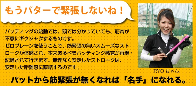 | ZERO-PLANEによるパット練習。「本番でもこれを付けてパットしたい」と思ってしまう。それほど、理想的なパッティングストロークが、自然に再現されるのです。こんなに簡単で無理の無い練習法は、初めてです。 |